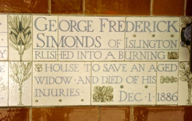 On a stone wall, underneath a makeshift overhang, are a series of ceramic plaques, each one painted beautifully with the names of people who died while trying to save the lives of others. One plaque reads: