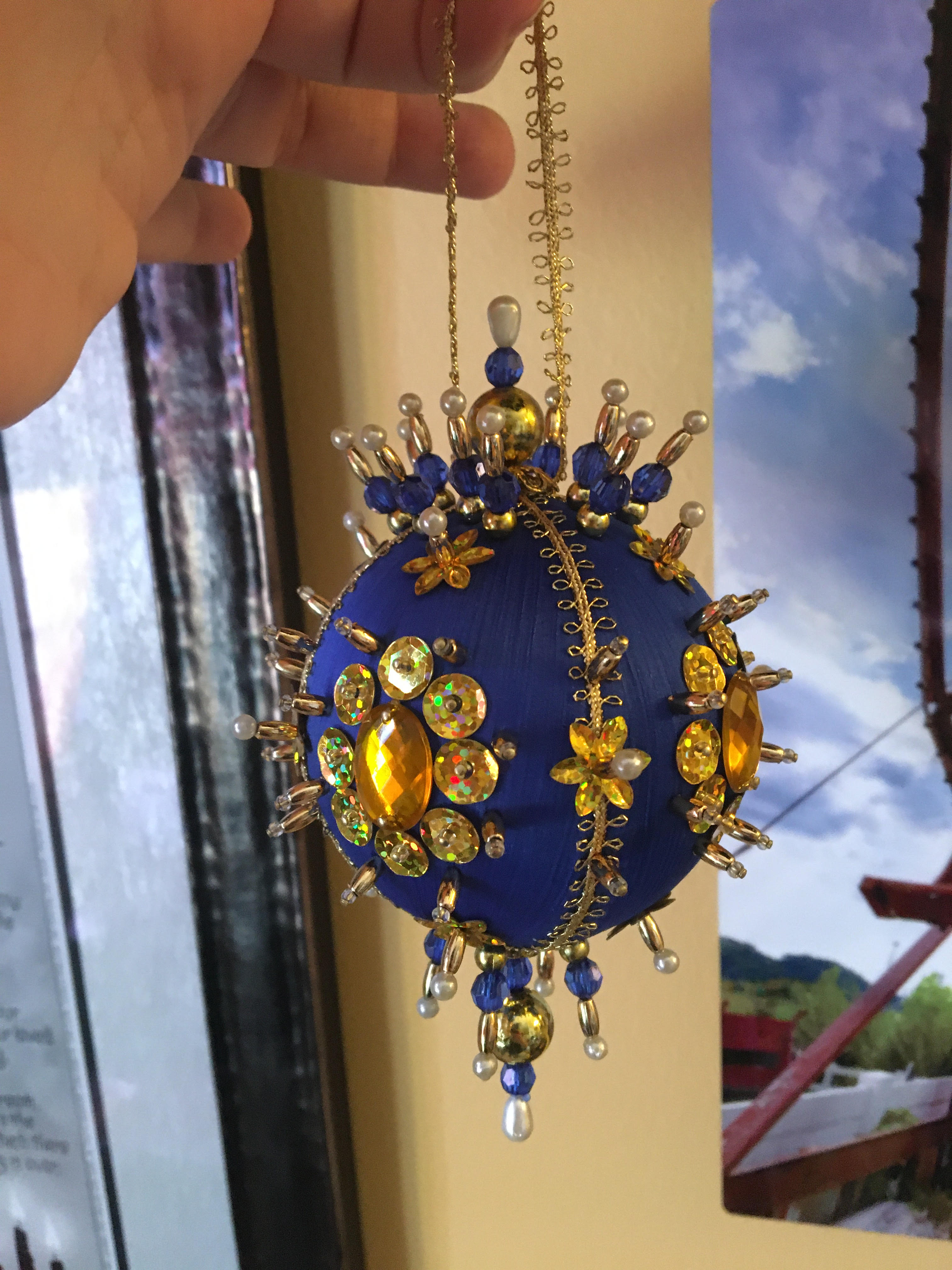 Craft Projects completed: 1 Finished an ornament! So pleased with myself. (Photo below: dark blue ornament with gold and pearl beads with a gold ribbon hanger. Victorian or Russian style.)